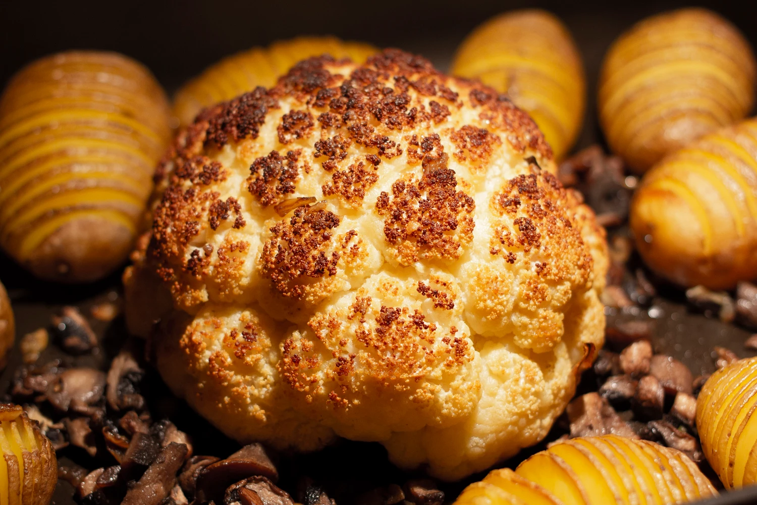 Helt blomkålshoved smurt med smør, drysset med urtesalt. 1 time i ovnen ved 180 grader.