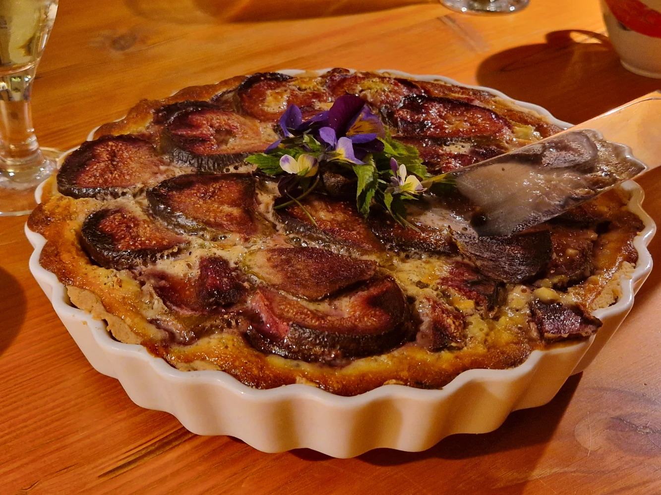 Skær fignerne i skiver og bag i ovnen på bagepapir, til de er tørret lidt ind og ikke safter mere. Arranger fignskiverne forsigtigt på tærten. Overhæld med flydende honning og bag videre i 15 minutter, eller til den er stivnet.